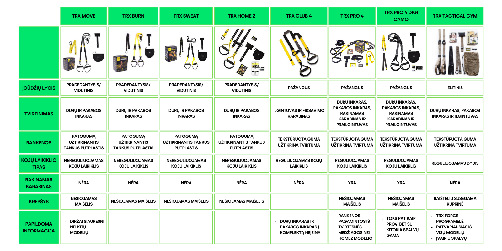 Ar TRX ir nepieciešamas tikai septiņas vienkāršas pamata kustības, lai sasniegtu efektīvus treniņu rezultātus - grūšana, vilkšana, "plankings" jeb balsts guļus, pagriešanās, nolieciens, izklupiens un pietupiens. Šīs vienkāršās kustības Tev palīdzēs sadedzināt taukus, palielināt ķermeņa spēku, uzlabot sirds veselību un izturību. TRX ir pieejams vairāk nekā 40 000 sporta zālēs, kas norāda uz to, ka šo zīmolu ir vērts iegādāties un izmēģināt! TRX neaprobežojas tikai ar viena veida produktiem. TRX piedāvā dažādas smaguma un medicīnas bumbas, spēka gumijas, svarcelšanas jostas un daudz citu produktu. Pārliecinies pats!