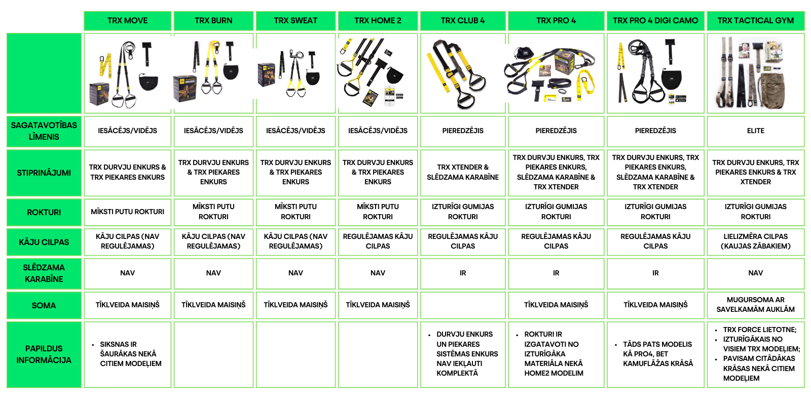 Ar TRX ir nepieciešamas tikai septiņas vienkāršas pamata kustības, lai sasniegtu efektīvus treniņu rezultātus - grūšana, vilkšana, "plankings" jeb balsts guļus, pagriešanās, nolieciens, izklupiens un pietupiens. Šīs vienkāršās kustības Tev palīdzēs sadedzināt taukus, palielināt ķermeņa spēku, uzlabot sirds veselību un izturību. TRX ir pieejams vairāk nekā 40 000 sporta zālēs, kas norāda uz to, ka šo zīmolu ir vērts iegādāties un izmēģināt! TRX neaprobežojas tikai ar viena veida produktiem. TRX piedāvā dažādas smaguma un medicīnas bumbas, spēka gumijas, svarcelšanas jostas un daudz citu produktu. Pārliecinies pats!